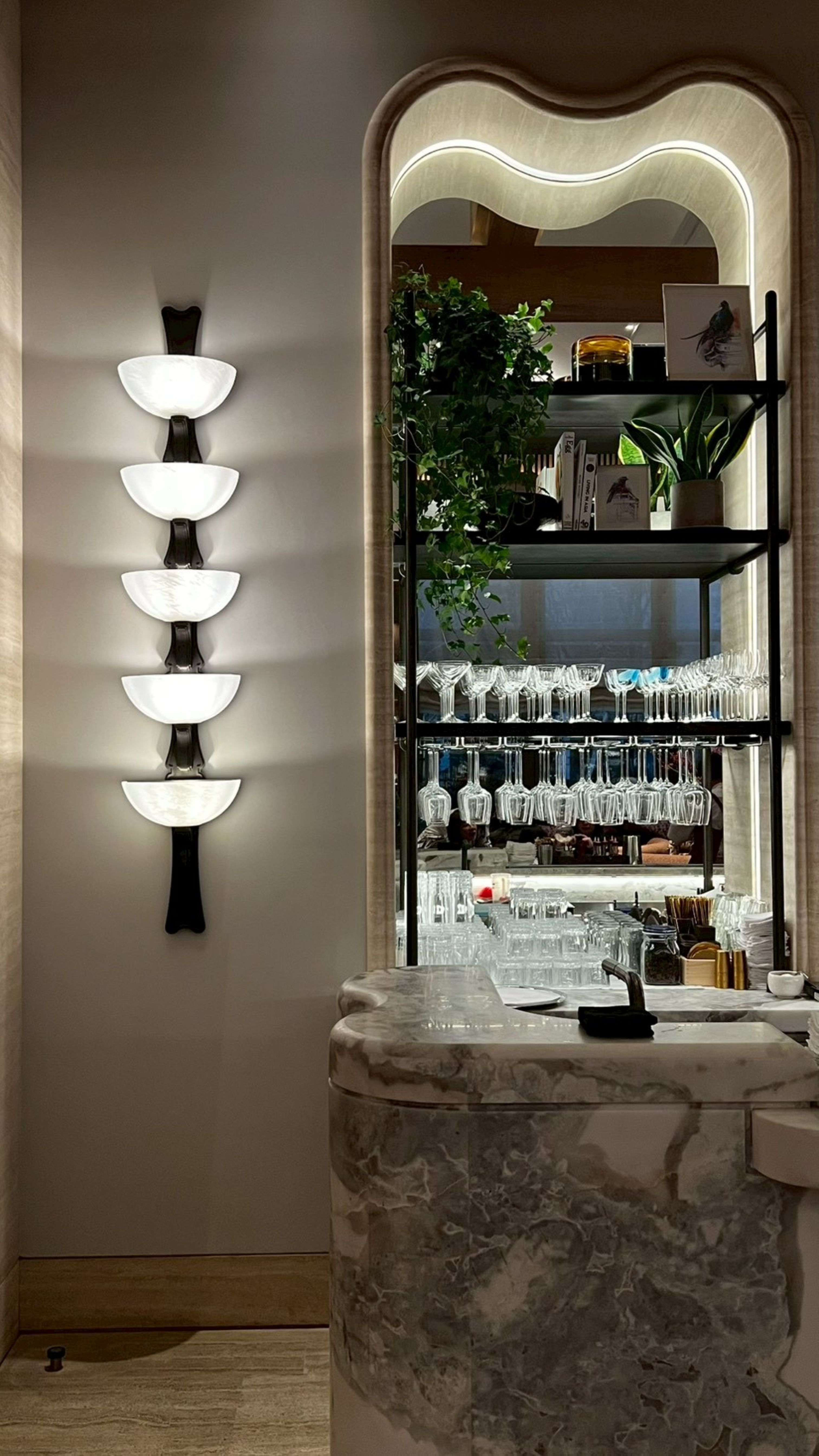 空間由 André Fu 設計,以木質、石材和金屬為主要語彙,透過線條層次堆疊,融合出東方氣質與現代奢華的調性。