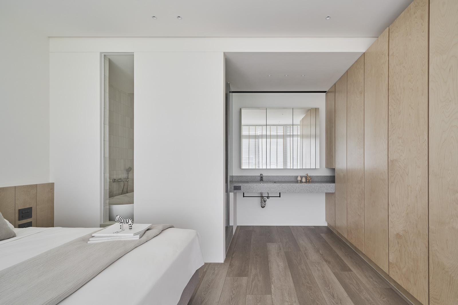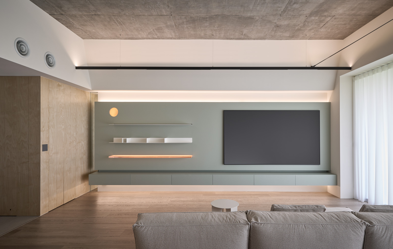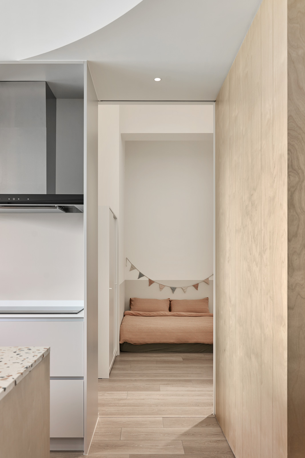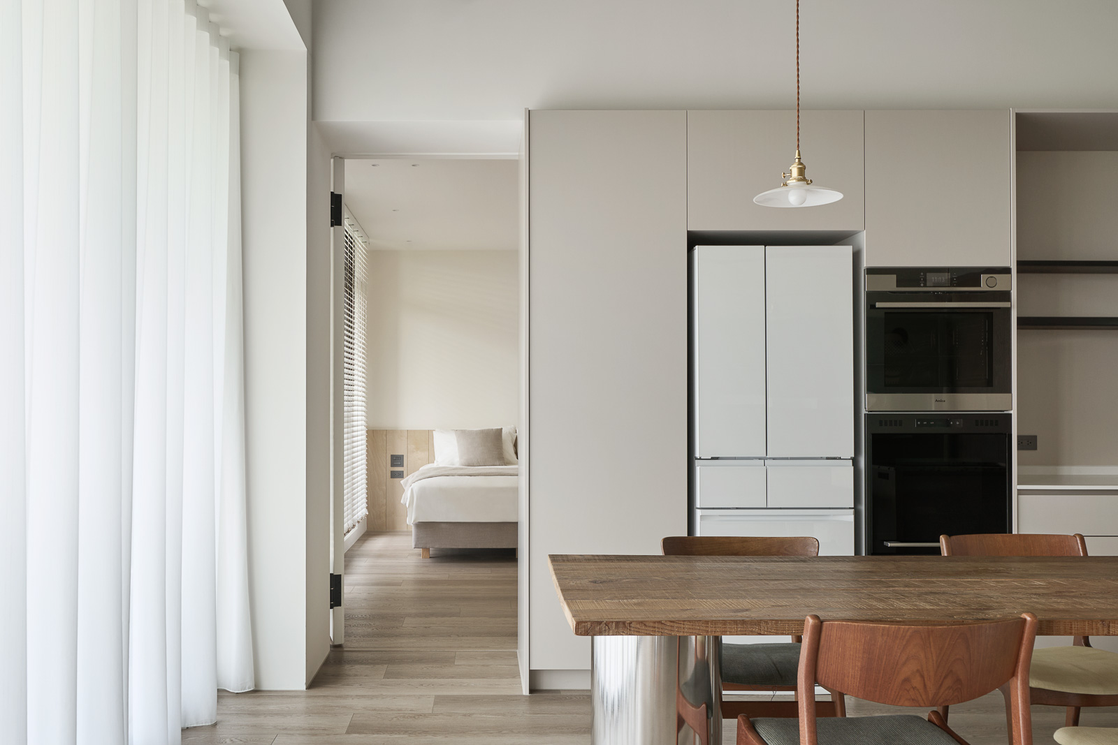 設計整體以自然原木紋理與淺色為基底,天花板保留材料本質,營造純粹樸實的空間氣息。從開放式廚房的中島延伸至沙發與客廳牆面,層層推進的關係,除去明確界線,增加空間的開闊與從容;透過線條引導,巧妙劃分出不同框景,同時串連起一家人的生活連結。客廳牆面如晨昏日落的橙色燈光柔和映照,與放眼大片田野的天然景色相互呼應。當折疊式落地門向外推開,徐徐微風拂入,歡笑交談迴盪的空間彷彿注入一份溫暖樸質。