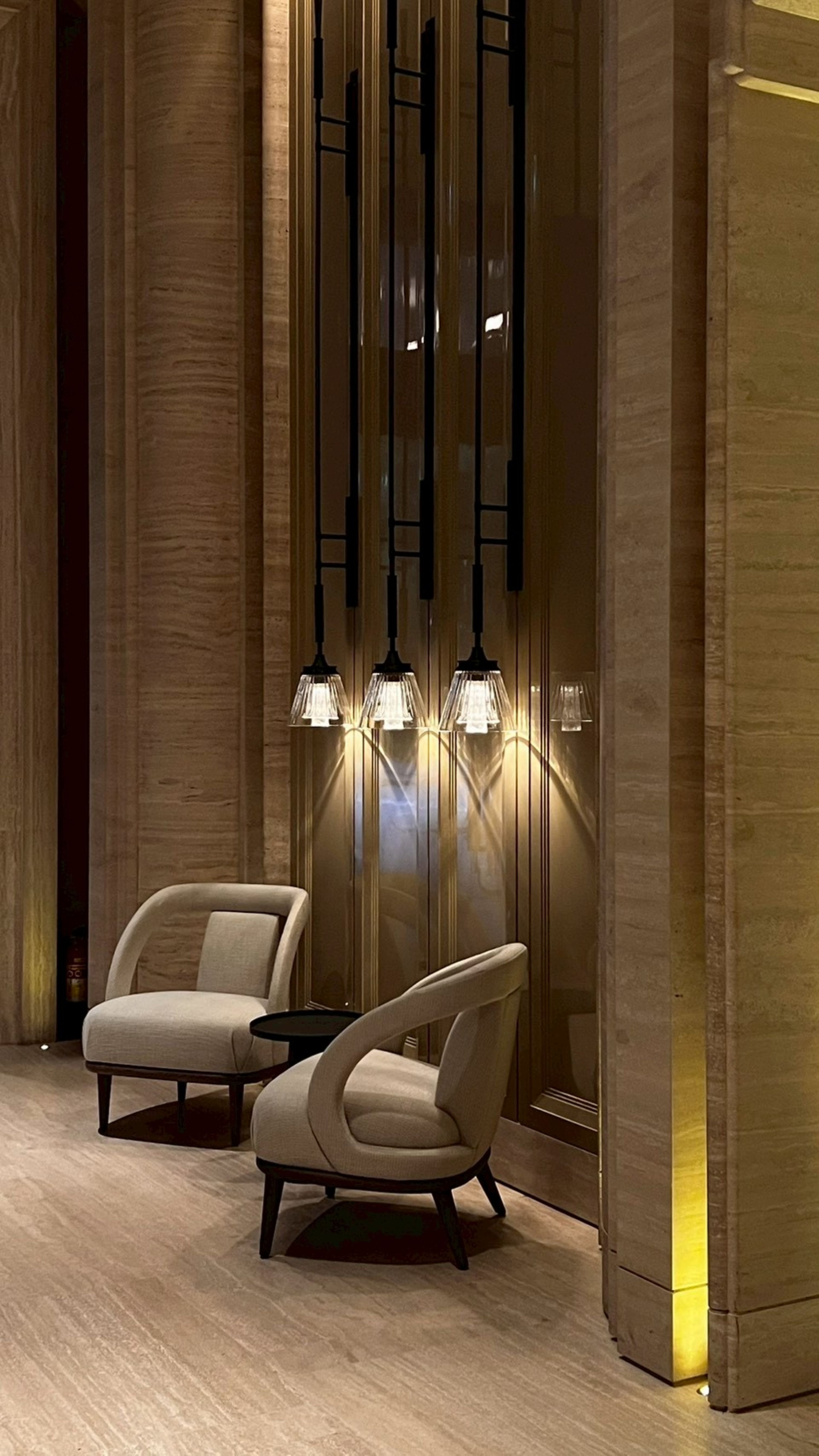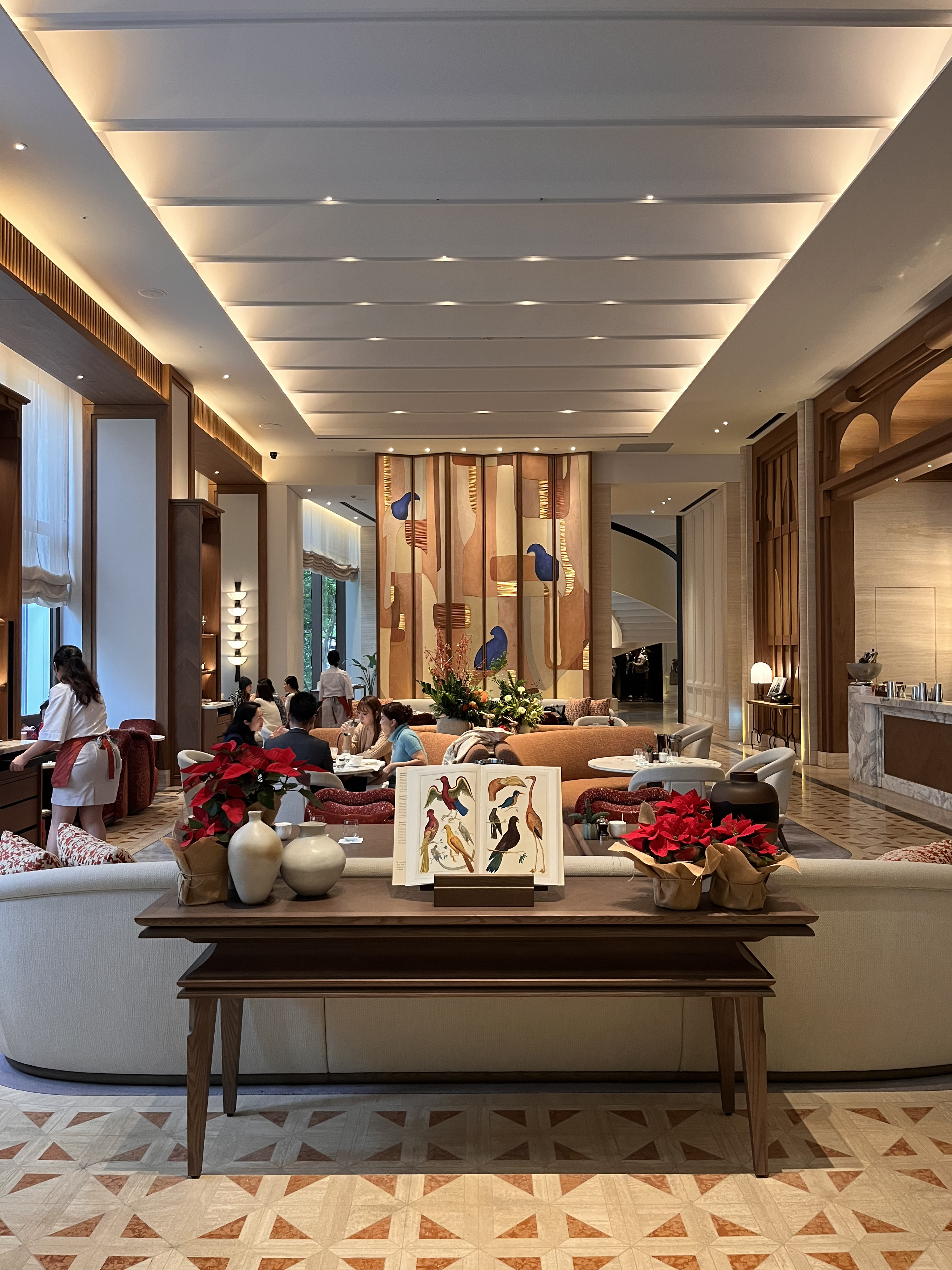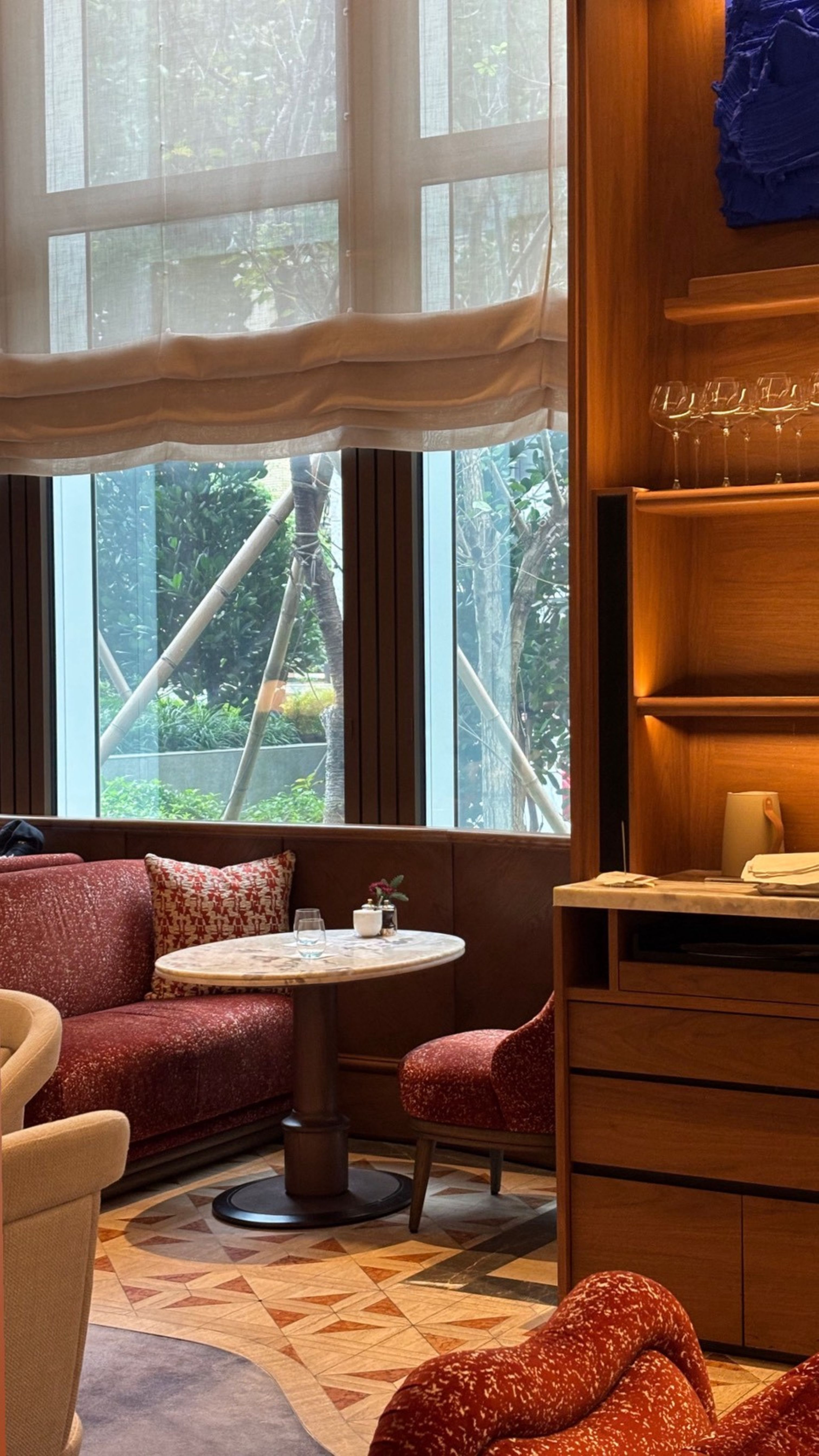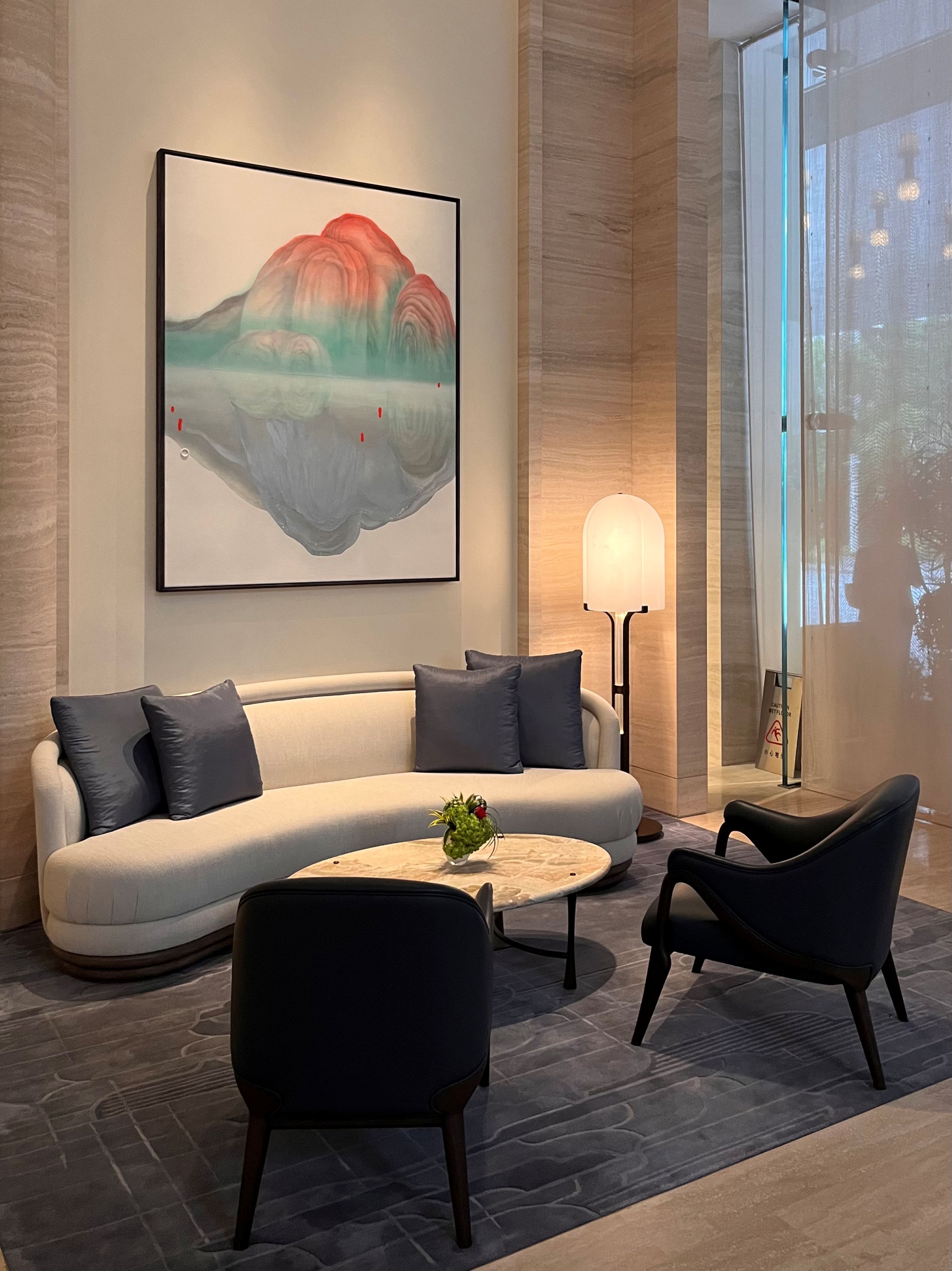 空間由 André Fu 設計,以木質、石材和金屬為主要語彙,透過線條層次堆疊,融合出東方氣質與現代奢華的調性。