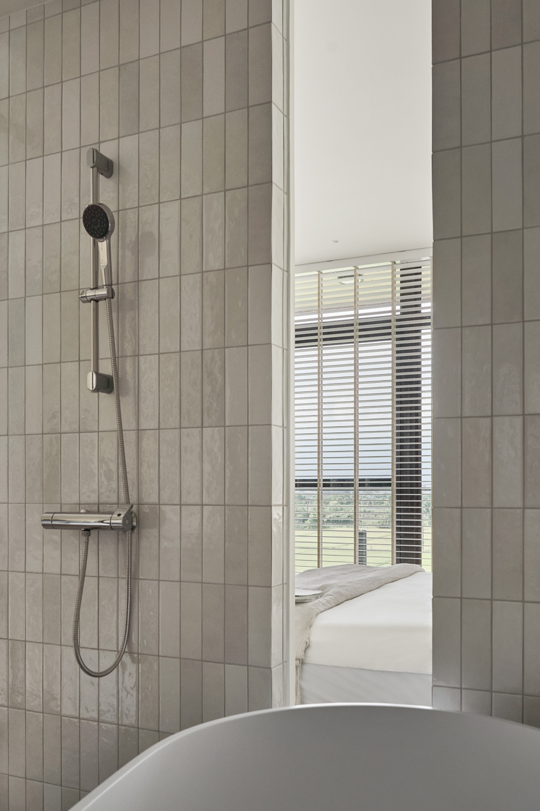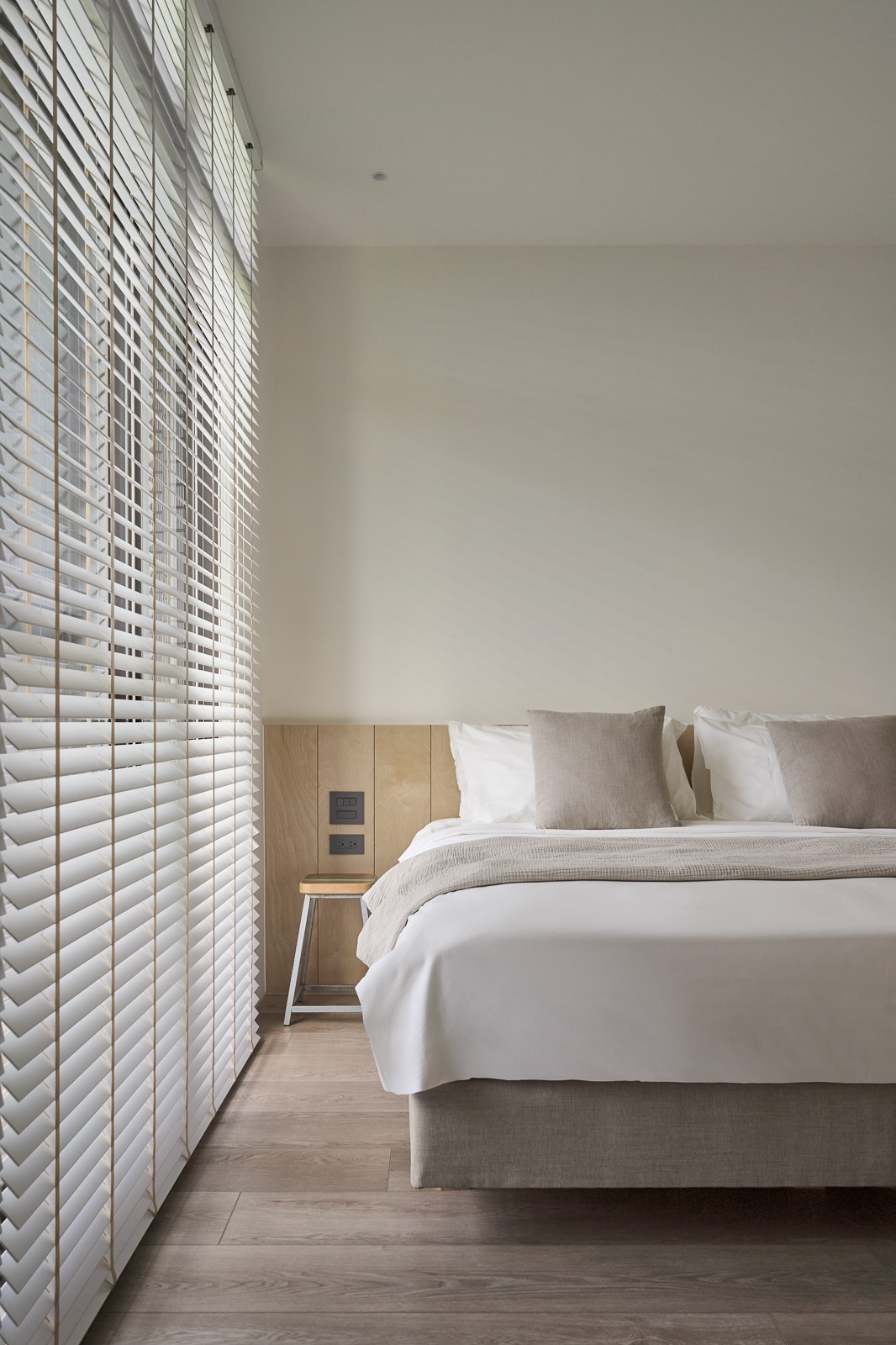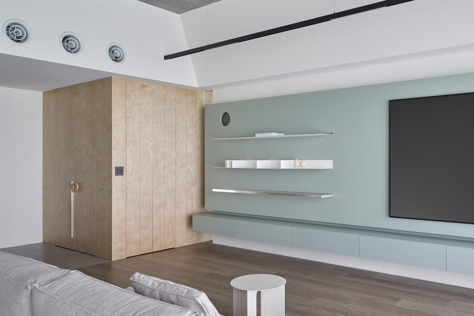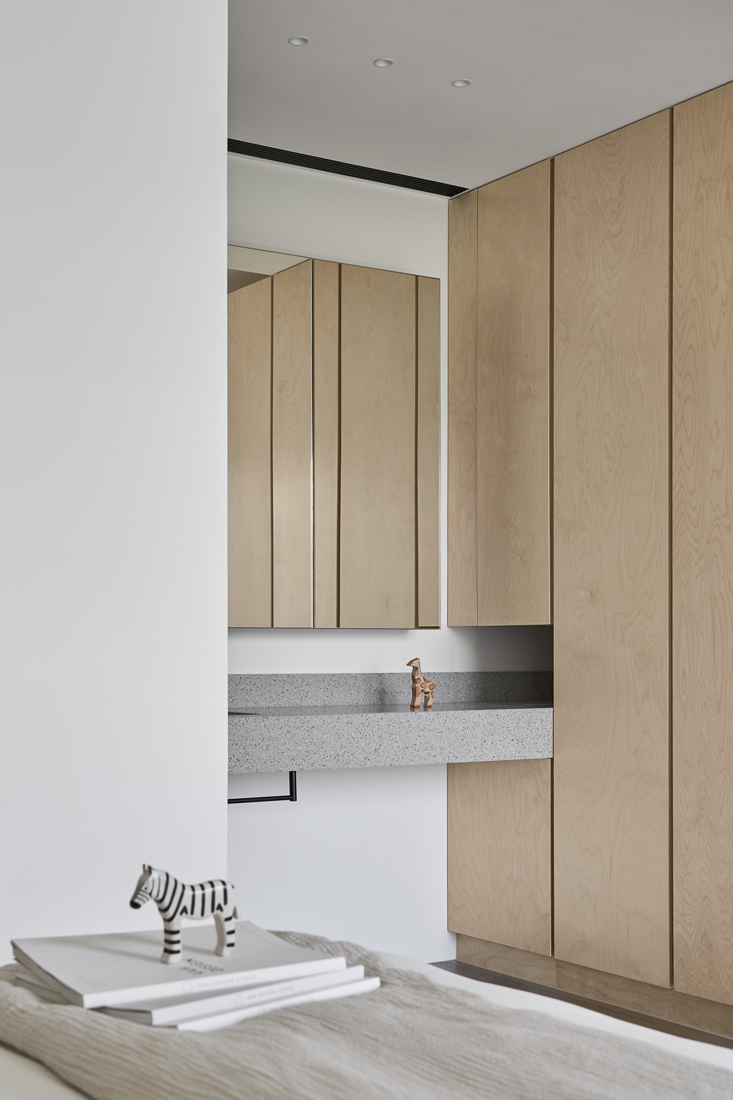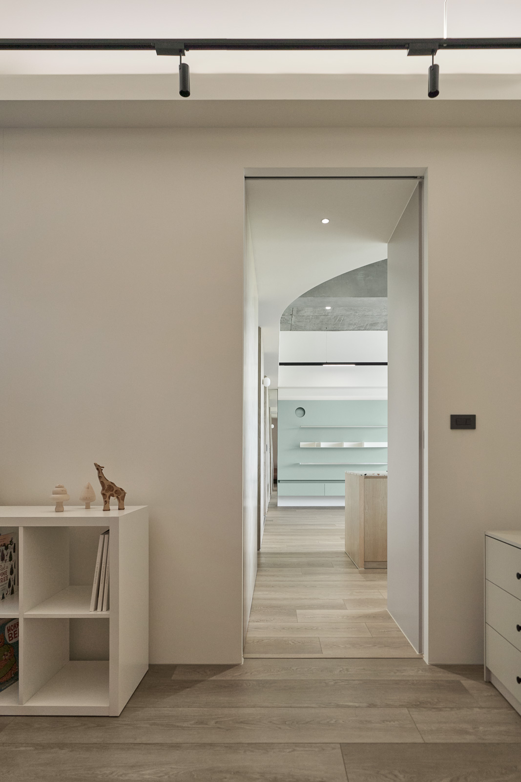 設計整體以自然原木紋理與淺色為基底,天花板保留材料本質,營造純粹樸實的空間氣息。從開放式廚房的中島延伸至沙發與客廳牆面,層層推進的關係,除去明確界線,增加空間的開闊與從容;透過線條引導,巧妙劃分出不同框景,同時串連起一家人的生活連結。客廳牆面如晨昏日落的橙色燈光柔和映照,與放眼大片田野的天然景色相互呼應。當折疊式落地門向外推開,徐徐微風拂入,歡笑交談迴盪的空間彷彿注入一份溫暖樸質。